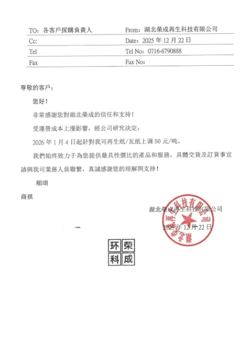 • 湖北榮成再生科技 2026年1月4日起,針對我司再生紙/瓦紙上調50元/噸。