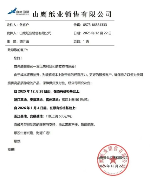 • 山鷹紙業 自2025年12月28日起,在原有價格基礎上: 浙江基地、安徽基地、宿州基地:高瓦上調50元/噸; 自2026年1月4日起,在原有價格基礎上: 浙江基地、安徽基地:T紙上調50元/噸;