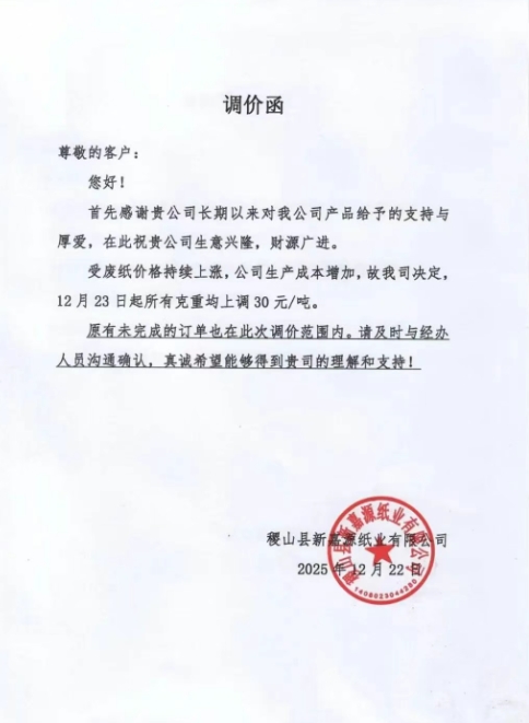 • 稷山縣新嘉源紙業有限公司 受廢紙價格持續上漲,公司生產成本增加,故我司決定,12月23日起所有克重均上調30元/噸。