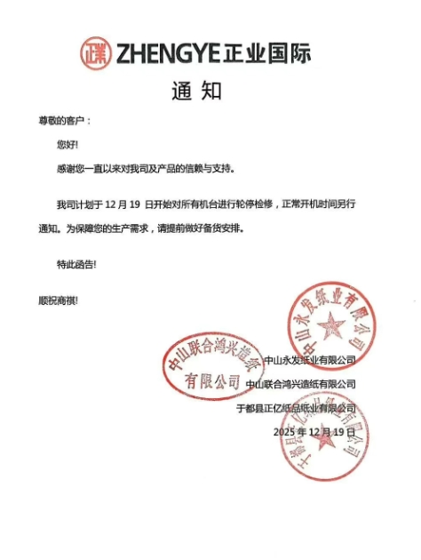 停機計劃 • 中山永發紙業有限公司/中山聯合鴻興造紙有限公司/于都縣正億紙品紙業有限公司 我司計劃于12月19日開始對所有機臺進行輪停檢修,正常開機時間另行通知。
