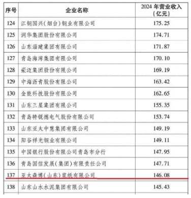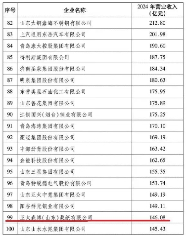 12月16日,山東省企業(yè)聯(lián)合會(huì)、山東省企業(yè)家協(xié)會(huì)聯(lián)合發(fā)布了《2025山東大企業(yè)發(fā)展研究報(bào)告》和2025山東企業(yè)200強(qiáng)、工業(yè)企業(yè)100強(qiáng)等名單。其中,亞太森博(山東)漿紙有限公司位列2025山東企業(yè)200強(qiáng)第137位,2025山東工業(yè)企業(yè)100強(qiáng)第99位。