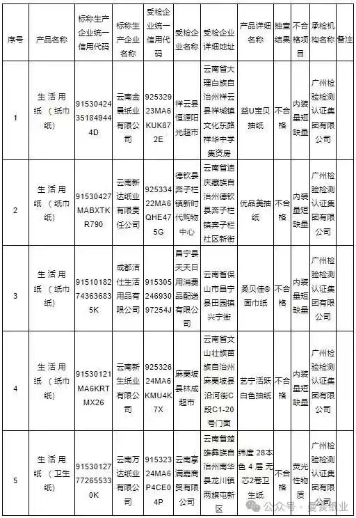 2025年,云南省市場監(jiān)督管理局按照年度工作計劃,在全省范圍內開展了生活用紙等產品質量監(jiān)督抽查,現(xiàn)將主要情況通報如下: 一、抽查基本情況 生活用紙主要包括生活中各種擦拭用的紙類產品,包括紙巾紙、衛(wèi)生紙、廚房用紙、擦手紙等。其中紙巾紙主要指日常生活所用的各種紙面巾、紙餐巾、紙手帕等,主要用于面部和手部的清潔,為避免在擦拭液體時搓條掉屑,因此對潤濕狀態(tài)下的紙張強度有一定要求。衛(wèi)生紙主要指廁用的衛(wèi)生用紙,是人民生活中不可或缺的紙種之一。廚房用紙是廚房專用的紙巾,它比一般的紙巾更大,更厚,吸水吸油性也更好,不僅適合清潔廚房中的油污、水漬,還可以用于食物加工烹飪時,直接吸干食物水分和油分。擦手紙是可以快速吸收手部水分、擦拭污漬與殘留的清潔用品。本次監(jiān)督抽查主要檢驗依據(jù)有:GB 15979-2024《一次性使用衛(wèi)生用品衛(wèi)生要求》、GB 15979-2002《一次性使用衛(wèi)生用品衛(wèi)生標準》、GB/T 20808-2022《紙巾》、GB/T 20810-2018《衛(wèi)生紙(含衛(wèi)生紙原紙)》、GB/T 26174-2023《廚房紙巾》、GB/T 24455-2022《擦手紙》、QB/T 4509-2013《本色生活用紙》等。主要檢驗項目有:D65亮度、可遷移性熒光物質/熒光性物質、內裝量短缺量/允許短缺量/凈含量、細菌菌落總數(shù)、大腸菌群、真菌菌落總數(shù)、綠膿桿菌/銅綠假單胞菌、金黃色葡萄球菌、溶血性鏈球菌等。 本次監(jiān)督抽查在全省16個州、市銷售環(huán)節(jié)共抽取57家單位銷售的60批次產品。抽查發(fā)現(xiàn)5批次產品不合格,不合格項目為內裝量短缺量、熒光性物質。 二、工作要求 針對本次監(jiān)督抽查發(fā)現(xiàn)的問題,有關州、市市場監(jiān)管部門要按照《中華人民共和國產品質量法》《產品質量監(jiān)督抽查管理暫行辦法》等有關要求,迅速組織做好監(jiān)督抽查結果處理工作,形成產品質量安全監(jiān)管閉環(huán)。 各州、市市場監(jiān)管局要持續(xù)加強涉及“一老一小”及學生、婦女的產品質量安全監(jiān)管,把兒童和學生用品安全守護行動常態(tài)化;要強化日常監(jiān)督檢查,對檢查、抽查中發(fā)現(xiàn)的不合格產品,要依法采取查封、扣押等措施,嚴禁生產銷售;對不合格產品生產銷售單位,要明確整改要求,嚴格督促落實整改措施,及時組織復查,并實施跟蹤抽查和重點監(jiān)管。對拒絕接受監(jiān)督抽查的、連續(xù)兩次抽查不合格的、涉嫌假冒的、無證生產的,要通過現(xiàn)場檢查、詢問情況、查閱合同發(fā)票等方式調查取證,查清違法事實,從嚴從快從重處置。違法行為涉嫌犯罪的,要及時移送司法機關。要督促抽查不合格生產銷售單位落實質量安全主體責任,按要求配備質量安全總監(jiān)和質量安全員,建立符合本單位實際的質量安全風險清單,落實日管控、周排查、月調度工作制度。 省局將加強抽查結果處置情況的跟蹤督辦,并視情通報。