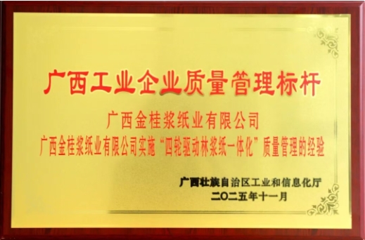 近年來(lái),金東紙業(yè)堅(jiān)定向綠、向智、向新轉(zhuǎn)型,成果顯著。在綠色低碳方面,金東環(huán)保總投入超20億元,并榮獲“國(guó)家級(jí)綠色工廠”、“全國(guó)水效領(lǐng)跑者”等稱號(hào);數(shù)智轉(zhuǎn)型上,金東自2019年開(kāi)啟數(shù)字化之路,并獲評(píng)“國(guó)家卓越級(jí)智能工廠”、“智能制造5G車(chē)間”等殊榮;產(chǎn)品創(chuàng)新層面,作為國(guó)家高新技術(shù)企業(yè),金東持續(xù)加大投入,進(jìn)一步推動(dòng)產(chǎn)品結(jié)構(gòu)優(yōu)化與多元化發(fā)展,近年投資建設(shè)的熱敏紙、特種紙新生產(chǎn)線已逐步投產(chǎn),彰顯實(shí)力與擔(dān)當(dāng)。 權(quán)威認(rèn)可 金桂漿紙榮獲“2025年廣西工業(yè)企業(yè)質(zhì)量管理標(biāo)桿”稱號(hào) 近日,廣西壯族自治區(qū)工業(yè)和信息化廳正式公布了2025年度“廣西工業(yè)企業(yè)質(zhì)量管理標(biāo)桿”名單,APP(中國(guó))旗下廣西金桂漿紙成功入選。這一榮譽(yù)標(biāo)志著金桂漿紙?jiān)谫|(zhì)量戰(zhàn)略、過(guò)程管控與可持續(xù)發(fā)展方面的實(shí)踐成果獲得權(quán)威認(rèn)可,為廣西工業(yè)質(zhì)量升級(jí)樹(shù)立了行業(yè)典范,也為傳統(tǒng)制造業(yè)向新質(zhì)生產(chǎn)力轉(zhuǎn)型提供可復(fù)制、可推廣的實(shí)踐范例。