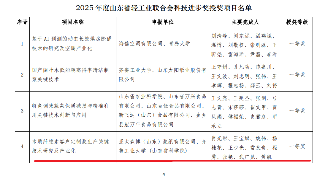 近日,山東省輕工業聯合會公布了2025年度科學技術獎獲獎名單,公司與齊魯工業大學(山東省科學院)聯合攻關的“木質纖維素客戶定制漿生產關鍵技術研究及產業化”項目,憑借突出的技術創新與產業化價值,成功斬獲2025年度山東省輕工業聯合會科技進步獎一等獎。