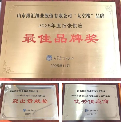 山東博匯紙業(yè)“太空梭”獲高教社多項(xiàng)榮譽(yù) 近日,山東博匯“太空梭”品牌榮獲高等教育出版社頒發(fā)的“2025年度紙張供應(yīng)最佳品牌獎(jiǎng)”。并榮獲2025年度圖書(shū)正文用紙供應(yīng)突出貢獻(xiàn)獎(jiǎng)和2025年度相關(guān)多元化業(yè)務(wù)(藍(lán)暢業(yè)務(wù))優(yōu)秀供應(yīng)商獎(jiǎng)項(xiàng),彰顯企業(yè)產(chǎn)品在支持出版教育事業(yè)方面的卓越貢獻(xiàn)。