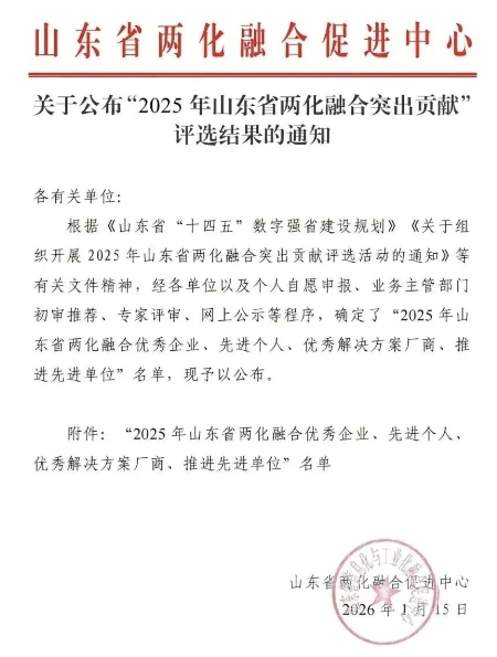 1月15日,山東省兩化融合促進中心公布“2025年山東省兩化融合突出貢獻”評選結果,公司憑借在兩化融合領域的卓越表現,獲評“山東省兩化融合優秀企業”。