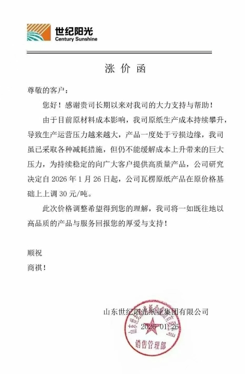 自2026年1月26日起,公司瓦楞原紙產(chǎn)品在原價(jià)格基礎(chǔ)上上調(diào)30元/噸。