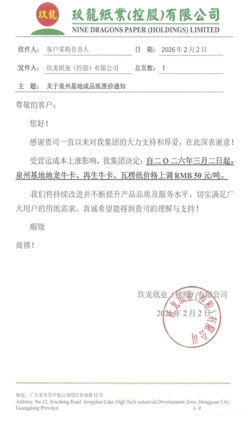 自三月二日起,泉州基地地龍牛卡、再生牛卡、瓦楞紙價格上調RMB 50元/噸。