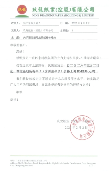 自三月二日起,湖北基地所有牛卡(含再生牛卡)價格上調RMB 50元/噸。