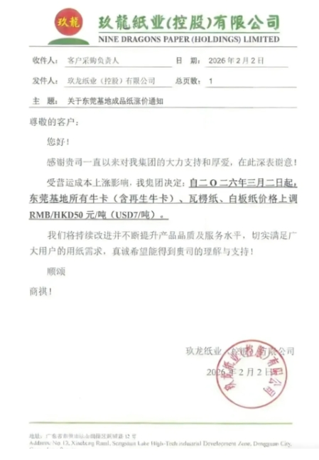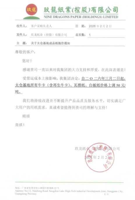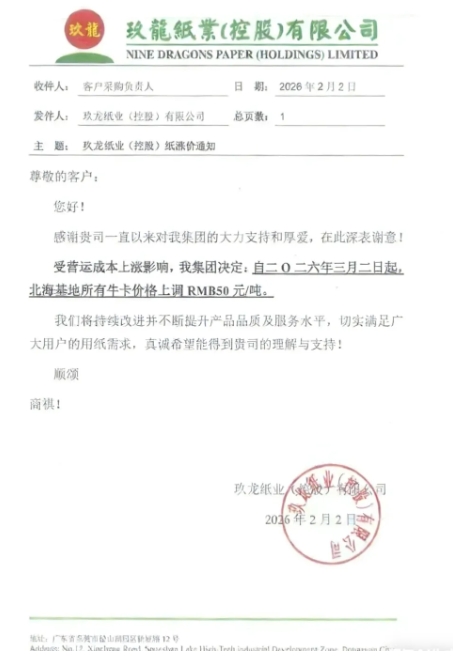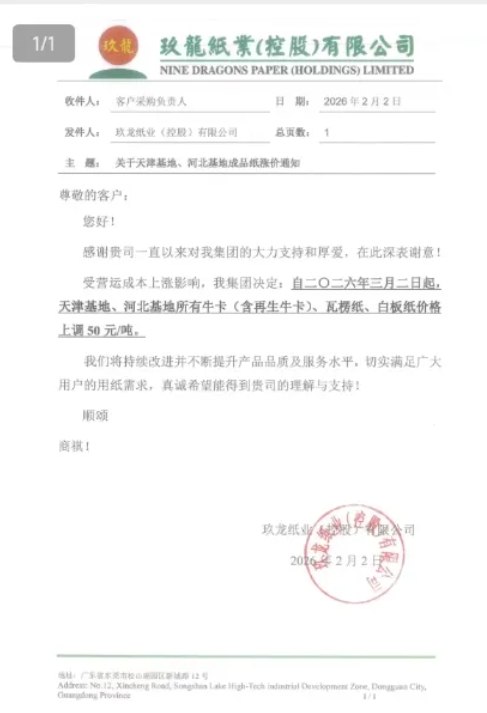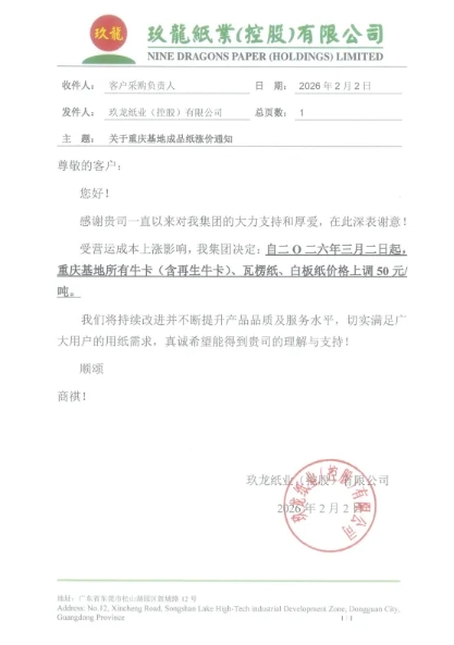 隨著春節臨近,受終端訂單釋放、紙企減產與下游紙板廠庫存低位等多重因素影響,市場供需格局發生變化,瓦楞紙市場展現出企穩回升跡象。近日,紙業巨頭玖龍九大基地再發調價通知,自三月二日起,牛卡、瓦楞紙等紙種價格普遍上調50元/噸。