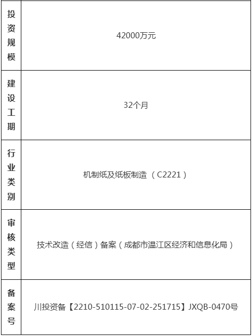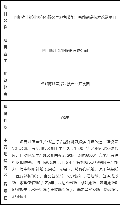 2026年2月24日四川省經(jīng)濟(jì)和信息化廳對(duì)四川錦豐紙業(yè)股份有限公司綠色節(jié)能、智能制造技術(shù)改造項(xiàng)目節(jié)能評(píng)審情況的報(bào)告進(jìn)行了公示。原則同意該項(xiàng)目節(jié)能報(bào)告。(項(xiàng)目代碼:2210-510115-07-02-251715)