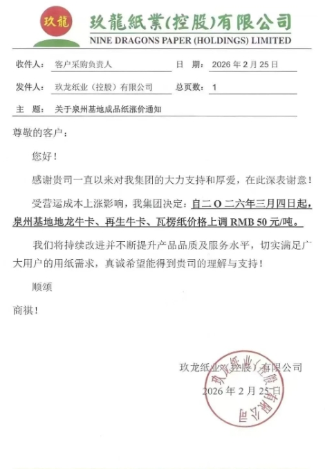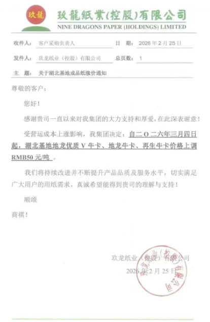 太倉(cāng)玖龍:3月4日起,地龍優(yōu)質(zhì)牛卡、地龍牛卡、再生牛卡、瓦楞紙價(jià)格上調(diào)50元/噸。