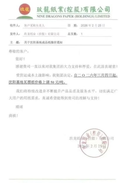 沈陽(yáng)玖龍:3月4日起,瓦楞紙價(jià)格上調(diào)50元/噸。