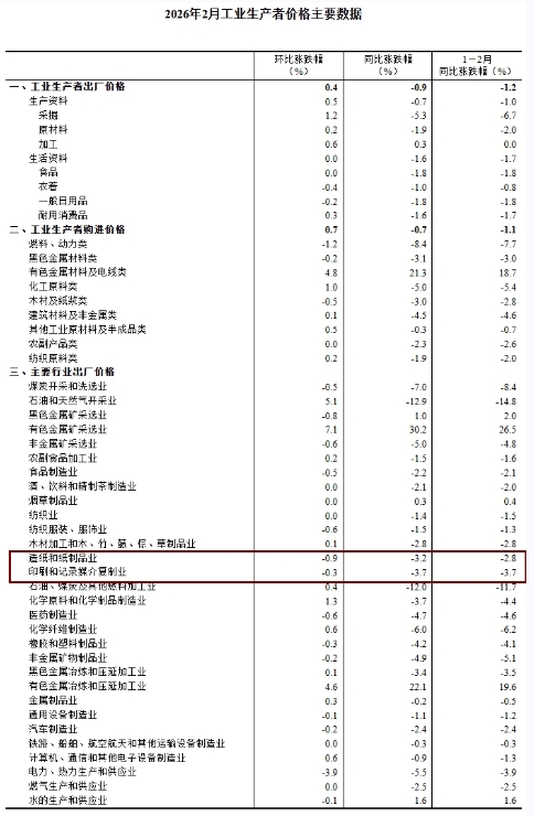 值得關(guān)注的是,2026年1-2月份印刷和記錄媒介復(fù)制業(yè)工業(yè)生產(chǎn)者出廠價(jià)格同比下降3.7%;造紙和紙制品業(yè)工業(yè)生產(chǎn)者出廠價(jià)格同比下降2.8%。