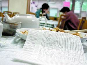 | 隨著人們生活水平的提高,生活用紙的產(chǎn)量不斷加大,一次性紙巾取代了傳統(tǒng)的手絹。出入餐廳、飯館用餐,人們難免要用餐巾紙,然而很少有人關(guān)心過(guò)它的質(zhì)量問(wèn)題。一些地下小廠批發(fā)大卷的劣質(zhì)衛(wèi)生紙,切割后軋上花樣,就成了“餐巾紙”;甚至用過(guò)的衛(wèi)生紙經(jīng)漂洗加工后,也成了潔白的“餐巾紙”。
