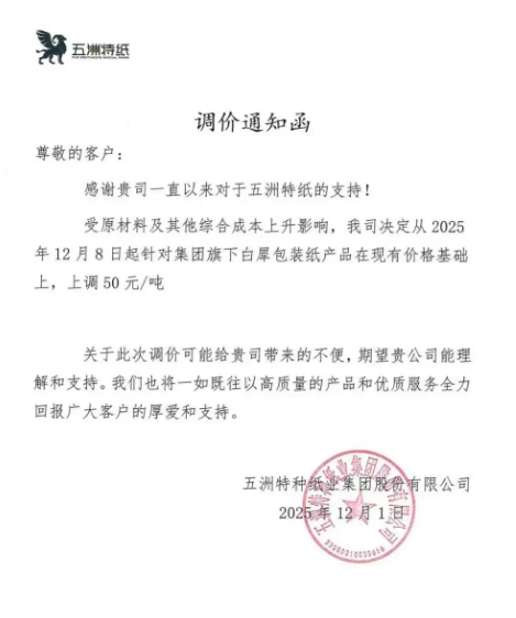 從12月8日起,針對集團旗下白犀包裝紙產品在現有價格基礎上,上調 50 元/噸。