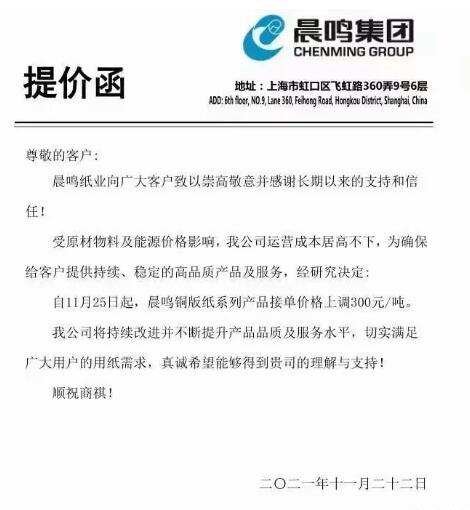 晨鳴集團:自11月25日起,晨鳴銅版紙系列產(chǎn)品接單價格上調(diào)300元/噸。