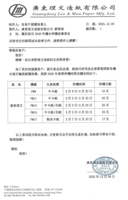廣東理文:5臺(tái)紙機(jī)將在2月停機(jī)15-22天,預(yù)計(jì)減產(chǎn)箱板瓦楞紙9.3萬噸和3萬噸灰底白板紙。